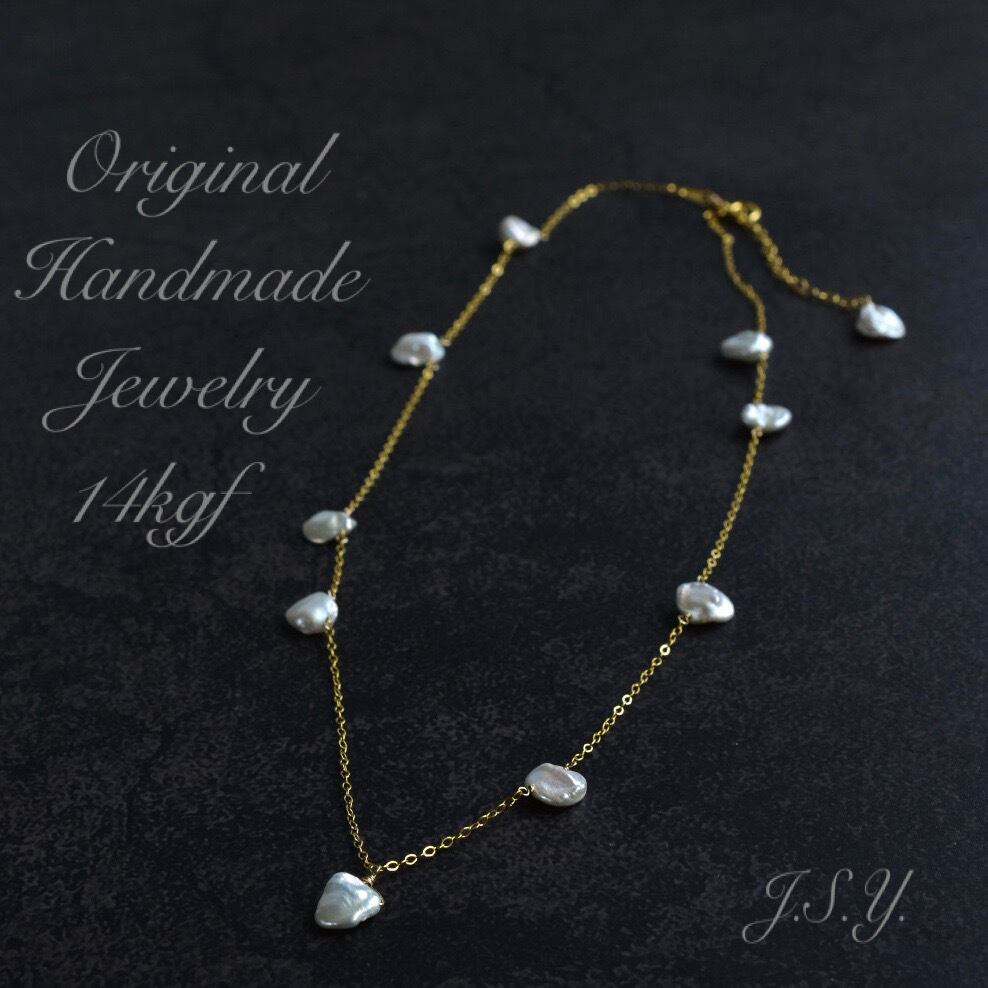 艶(遊色)がきらめく淡水ケシパール をランダムに配置し、14kgf チェーンでつなぎ合わせたネックレスです。