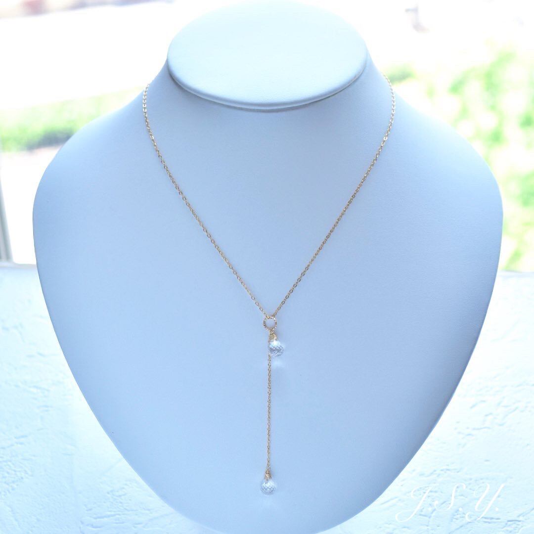 首元から胸元に下がった宝石質クリスタルのダブルドロップY字ネックレス。