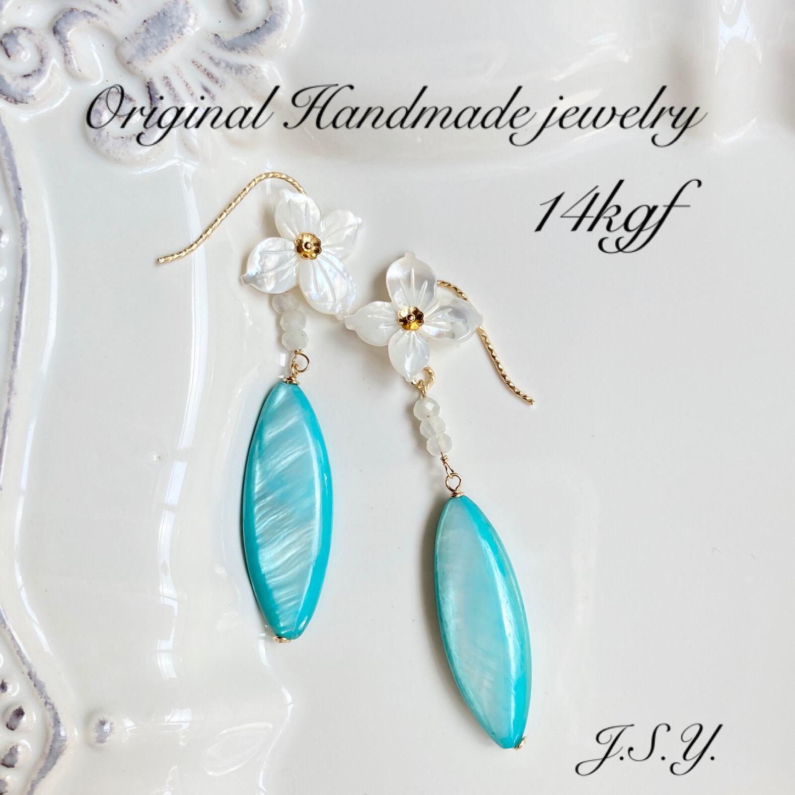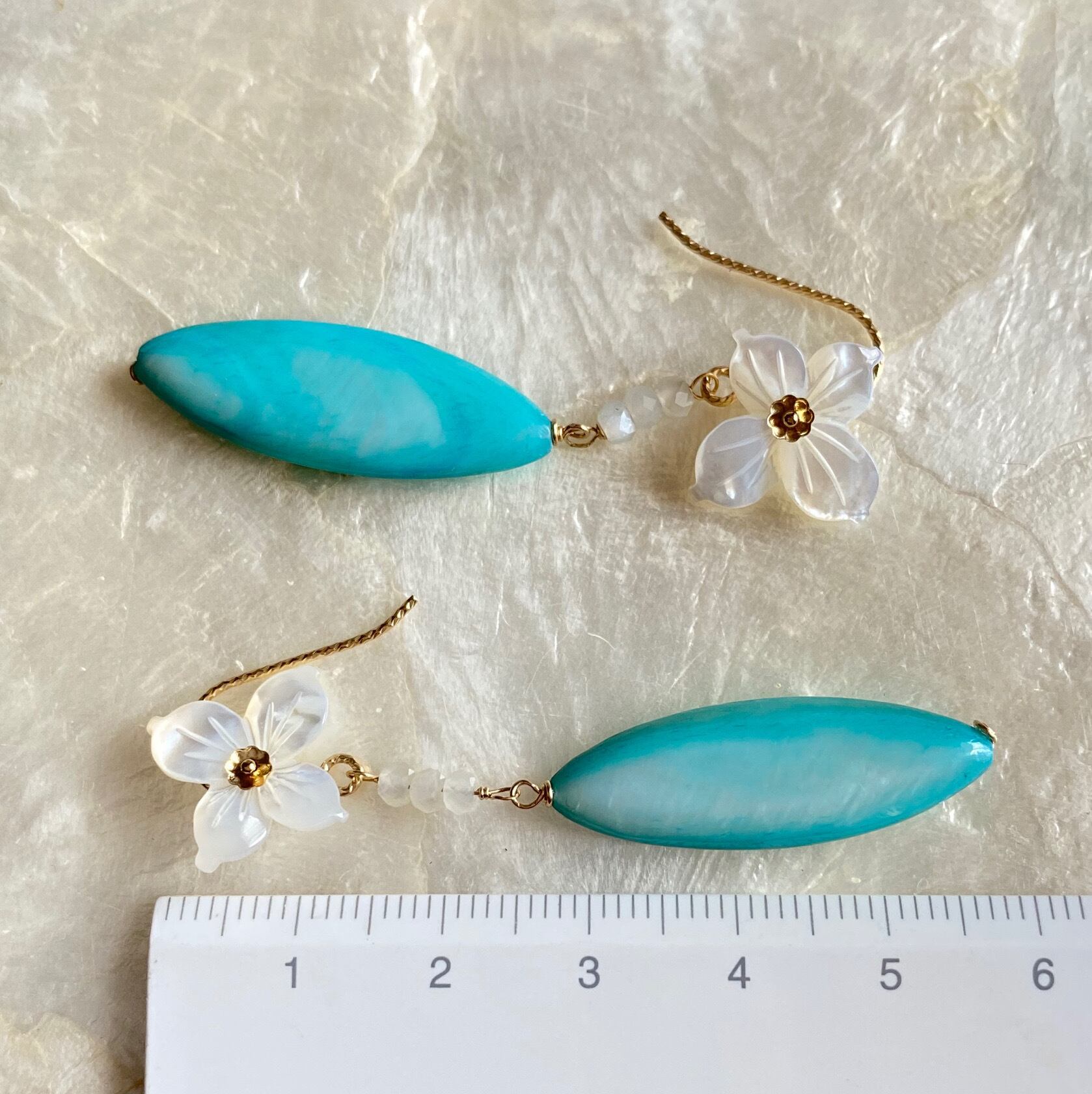 ☆高級感のある艶が魅力のホワイトシェル(白蝶貝)のシェルフラワー、たて長マーキス型のカラーシェル(エメラルドブルー)、ホワイトムーンストーンを使用し、バカンスシーズンに活躍しそうなシックなピアスにお仕立てしました。