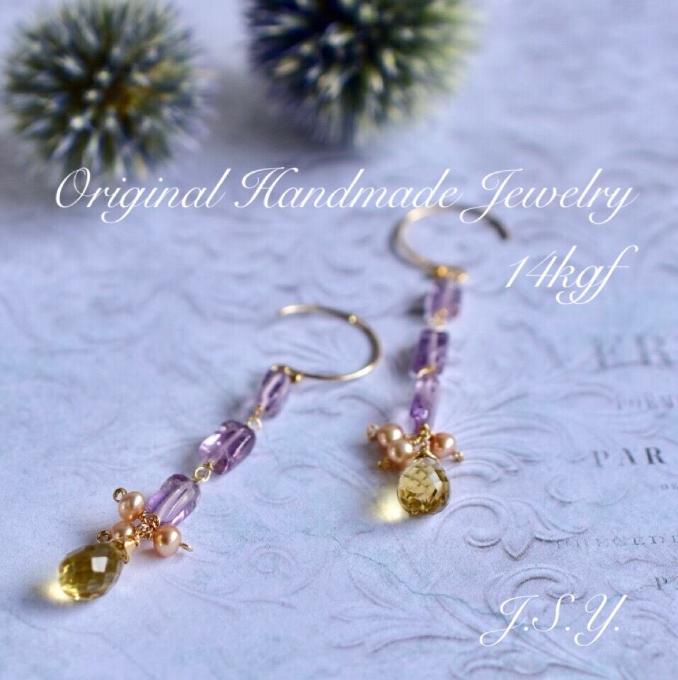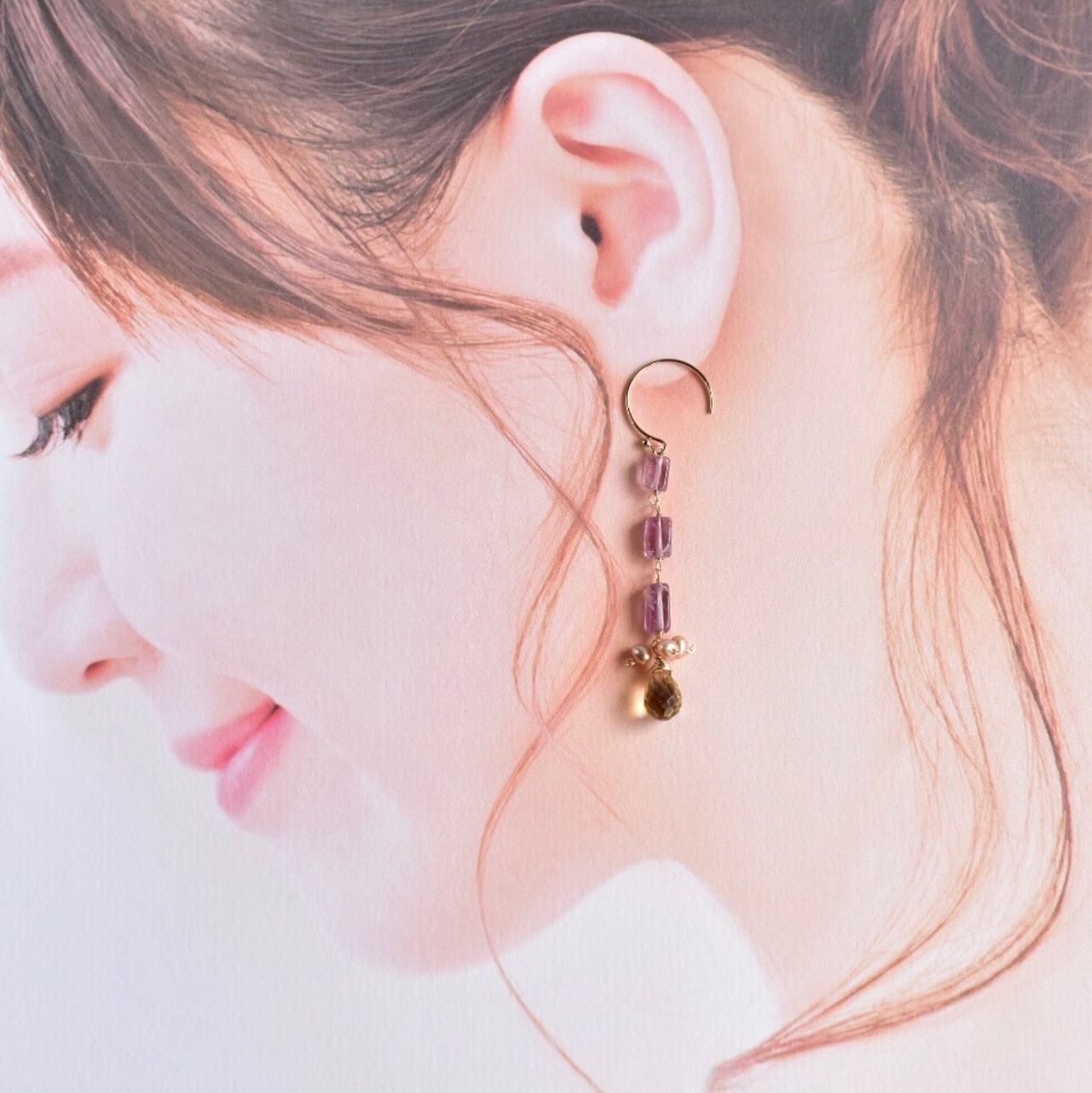 サーモンピンクの淡水パールと、長方形のアメジストを合わせて肌馴染みの良いセミロングピアスに仕立てました。