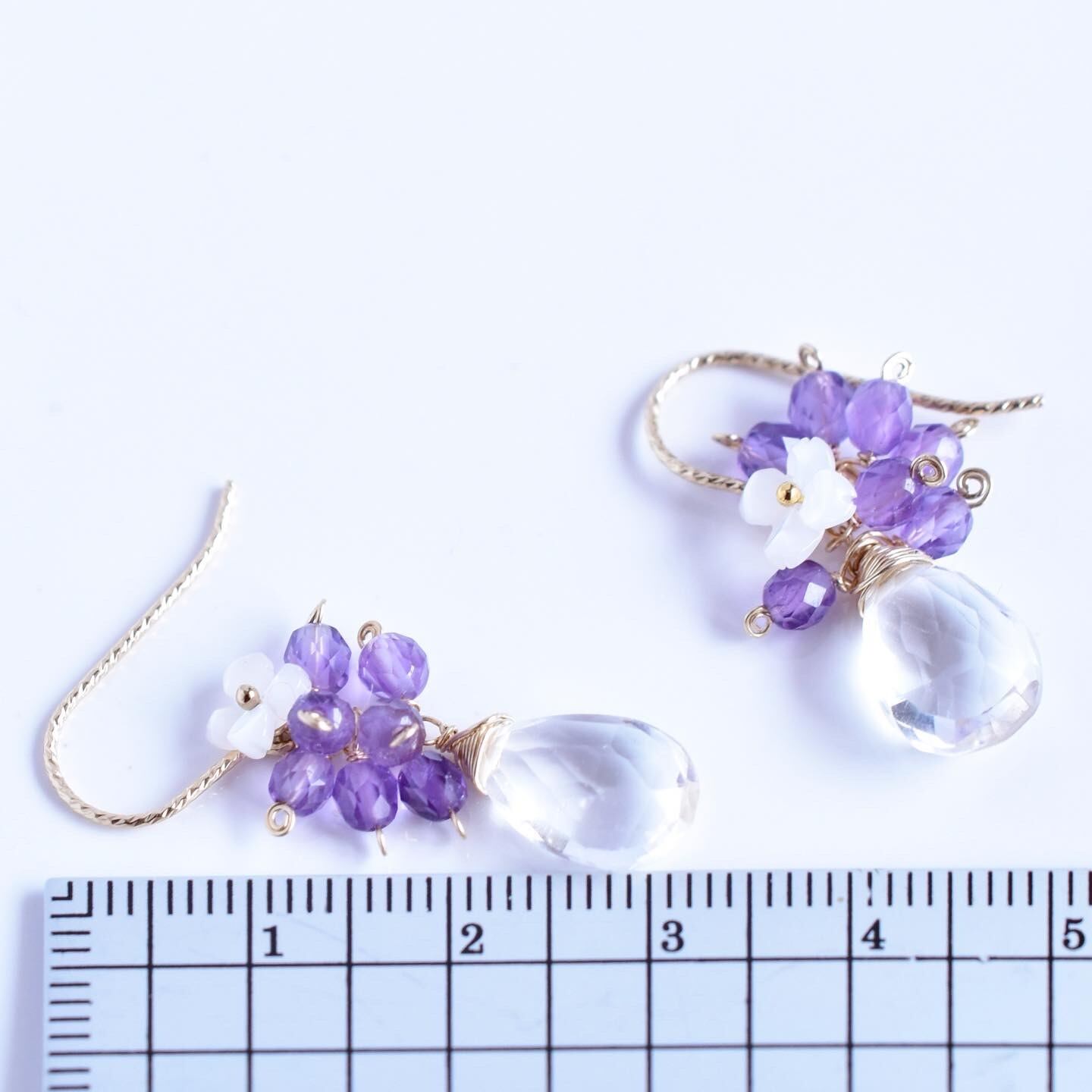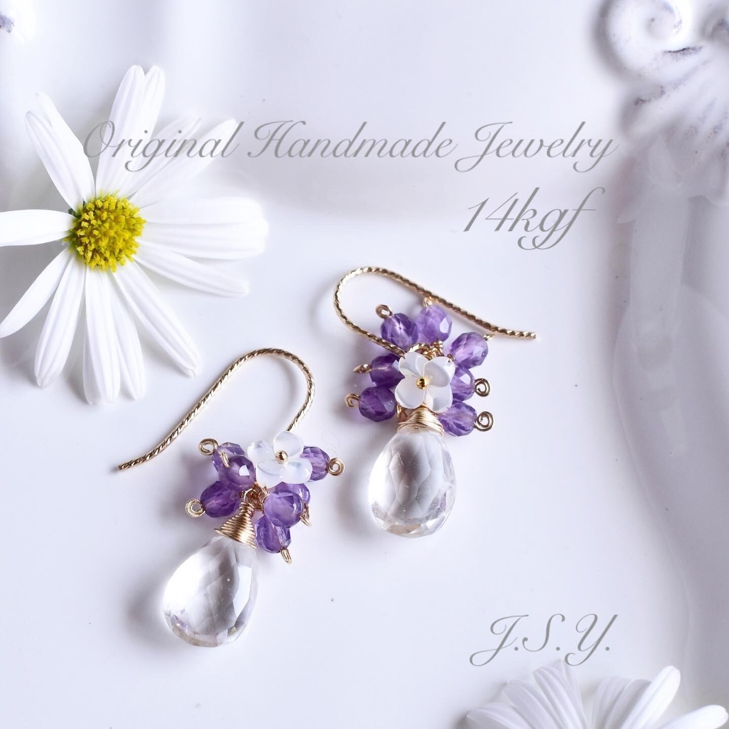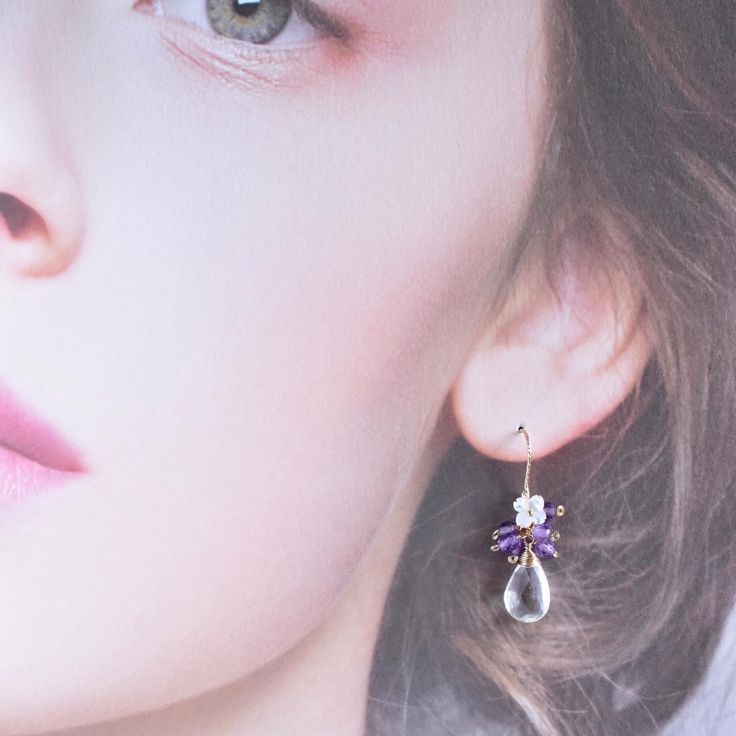 カット、輝きが美しいペアシェイプ型の宝石質クリスタルに小粒のアメジスト を散りばめて、かわいらしいシェルフラワーをあしらい、エレガントでシックなピアスにお仕立てしました。14kgf グリッターのピアスフックもキラキラできれいです。