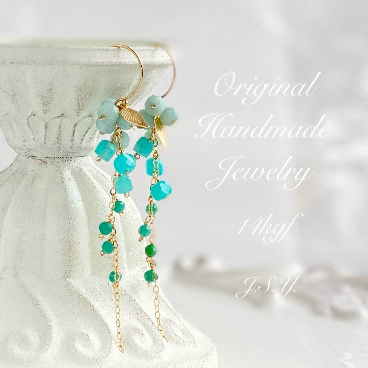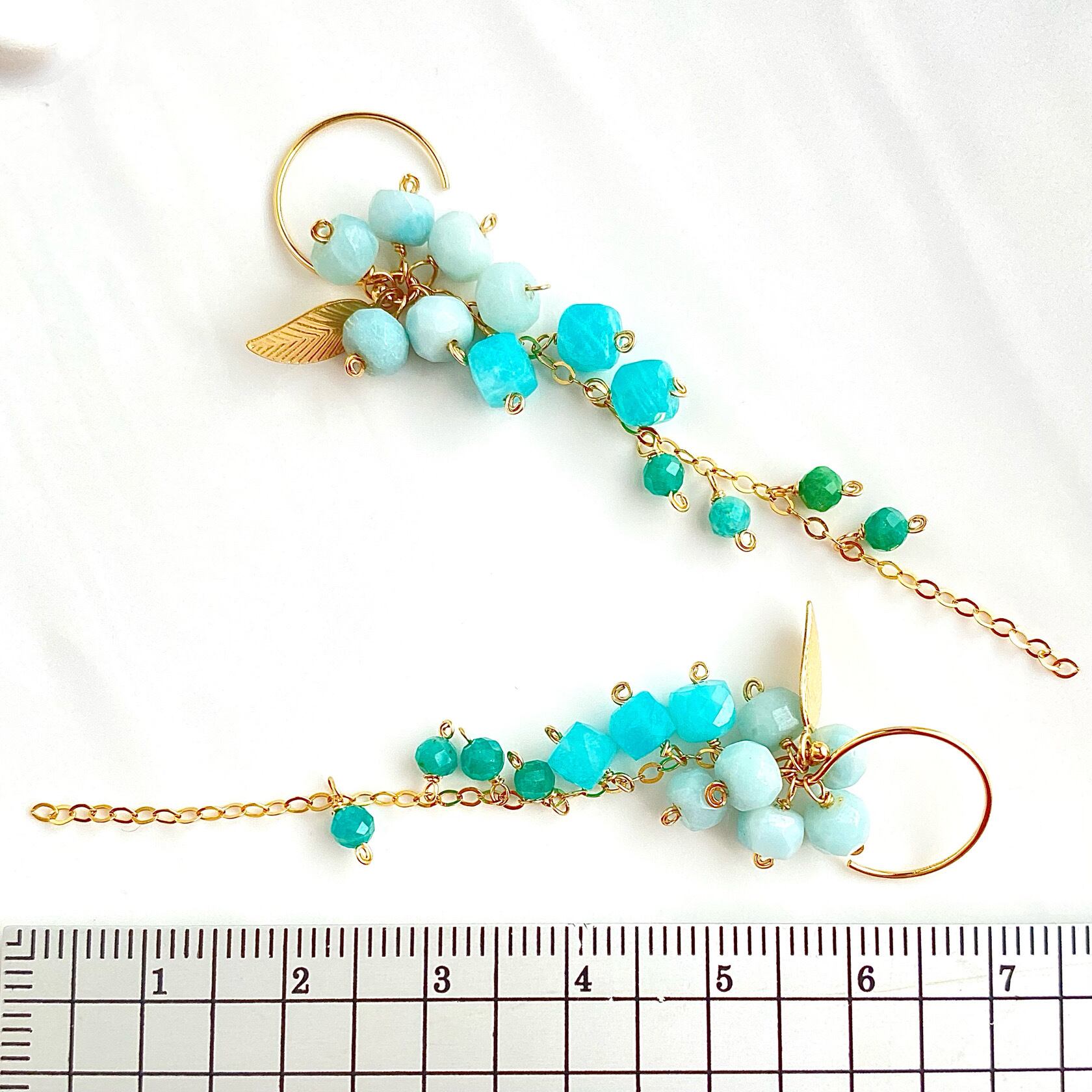 産地の違いでカラーが違うアマゾナイトを野葡萄みたいにグラデーションで垂らしたセミロングピアス