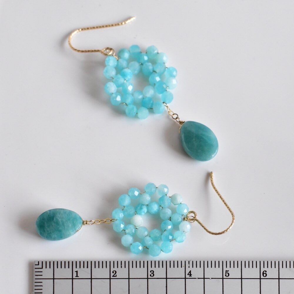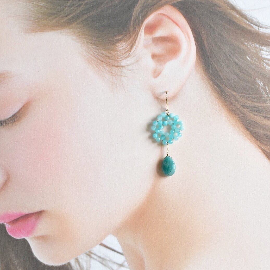 アマゾナイトの小粒天然石で編んだリースにペアシェイプ型ロシアンアマゾナイトを垂らしたピアスです。