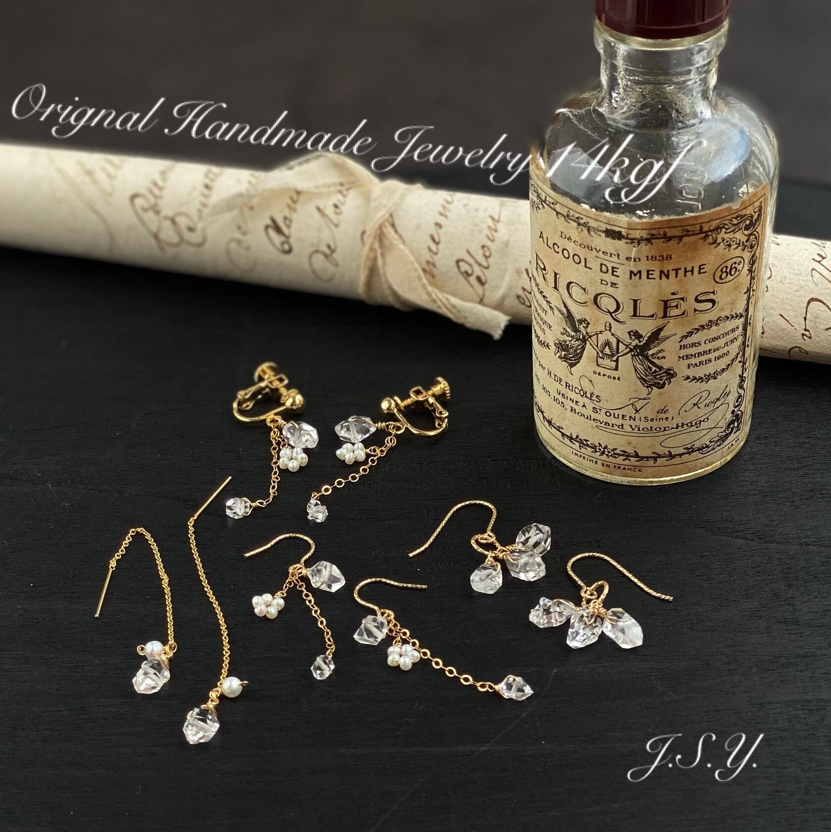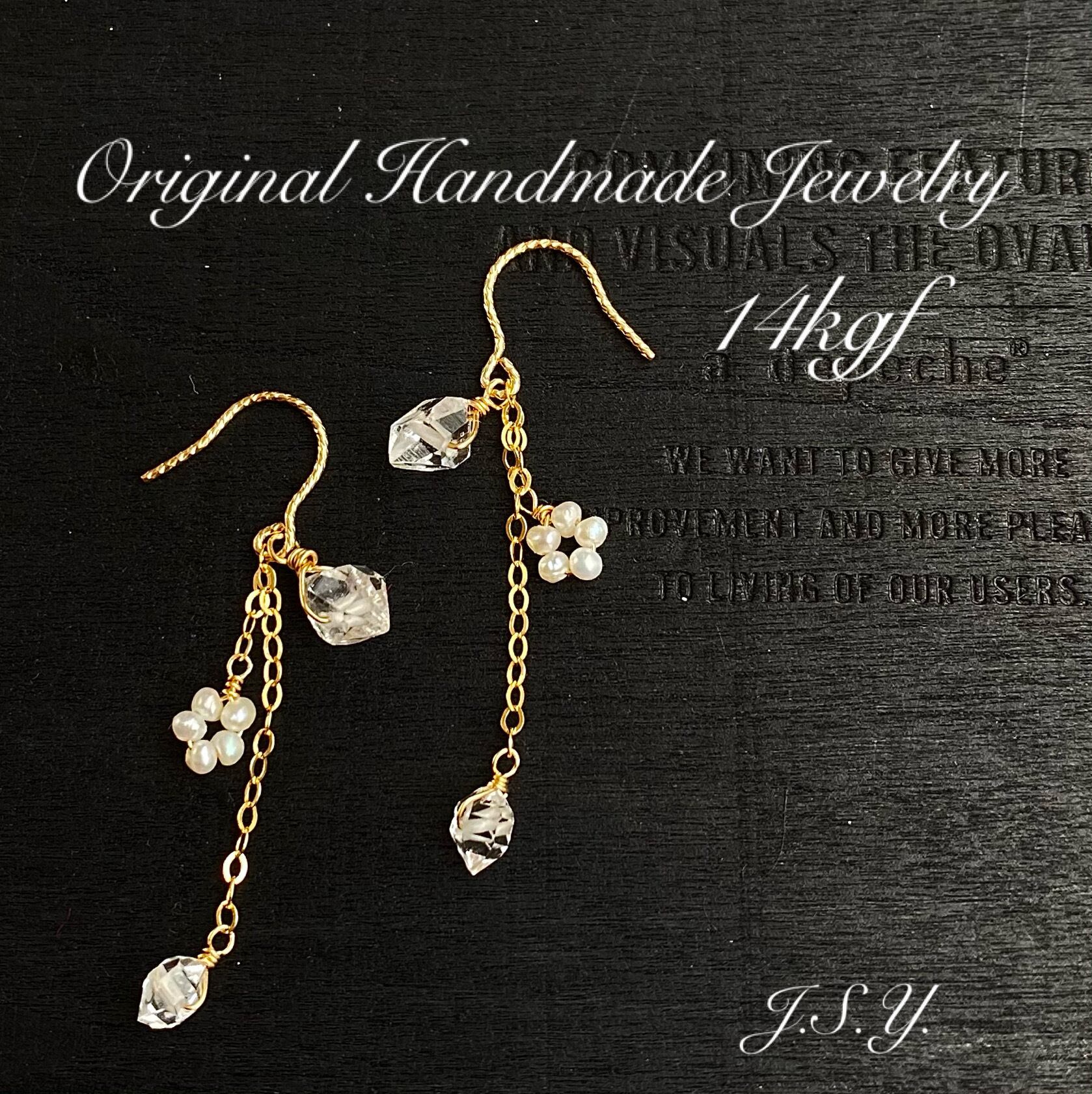 輝きの美しいニューヨーク産ハーキマーダイアモンドをグラデーションで2個と希少な極小淡水パールを小花型にアレンジしてチェーンで垂らしました。