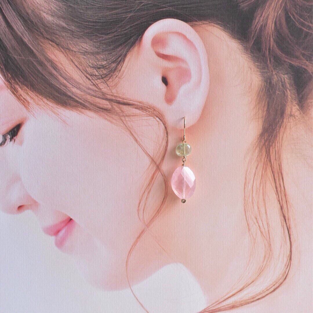 ふわっとした透明感、ツイストオーバルカットが美しいローズクォーツと同じくふわっとした透明感のプレナイトを合わせた優しい配色のピアスです。