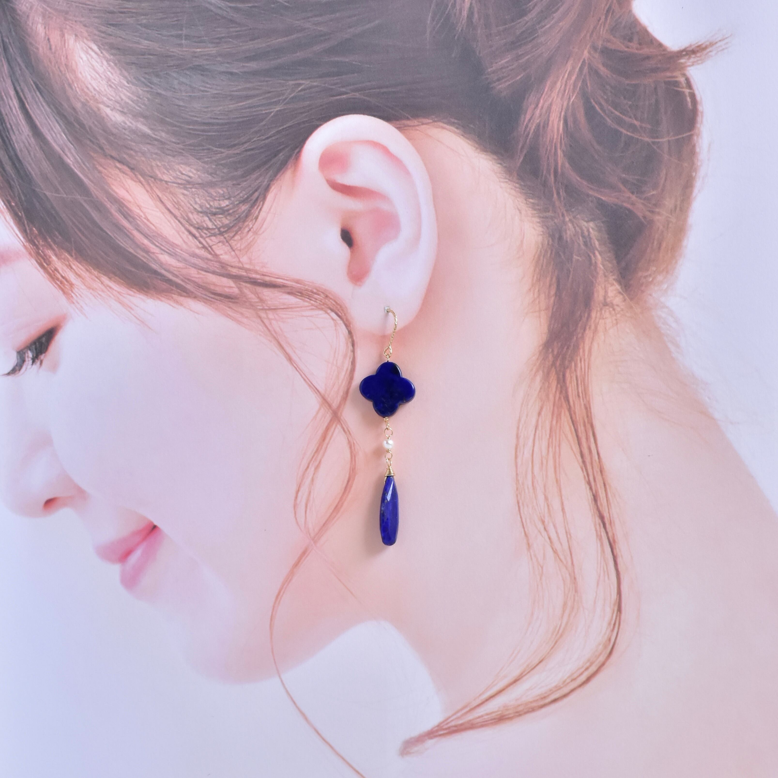 同じく、カット、カラーが美しいロングドロップファセットカットのラピスラズリを組み合わせた大人ピアス(イヤリング)