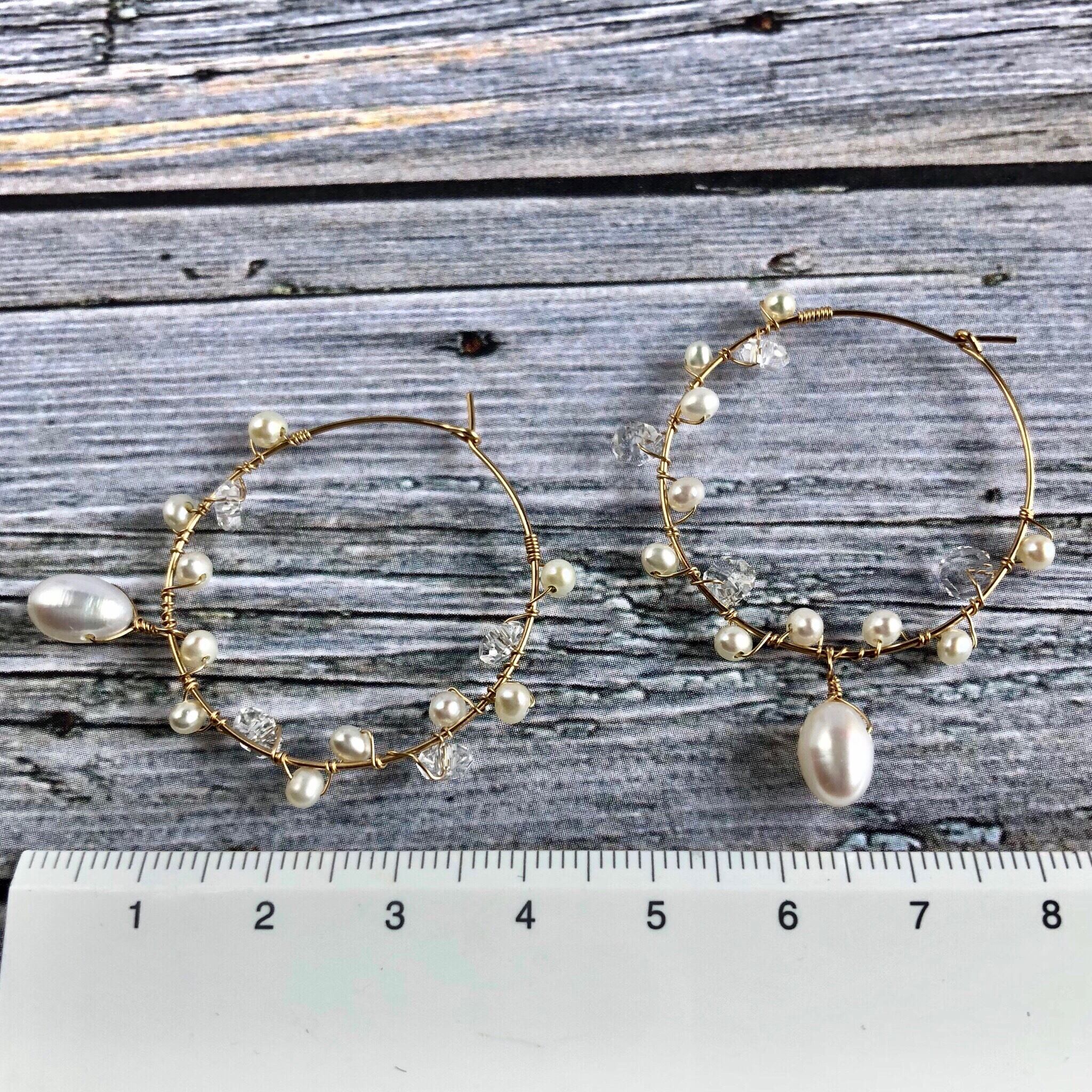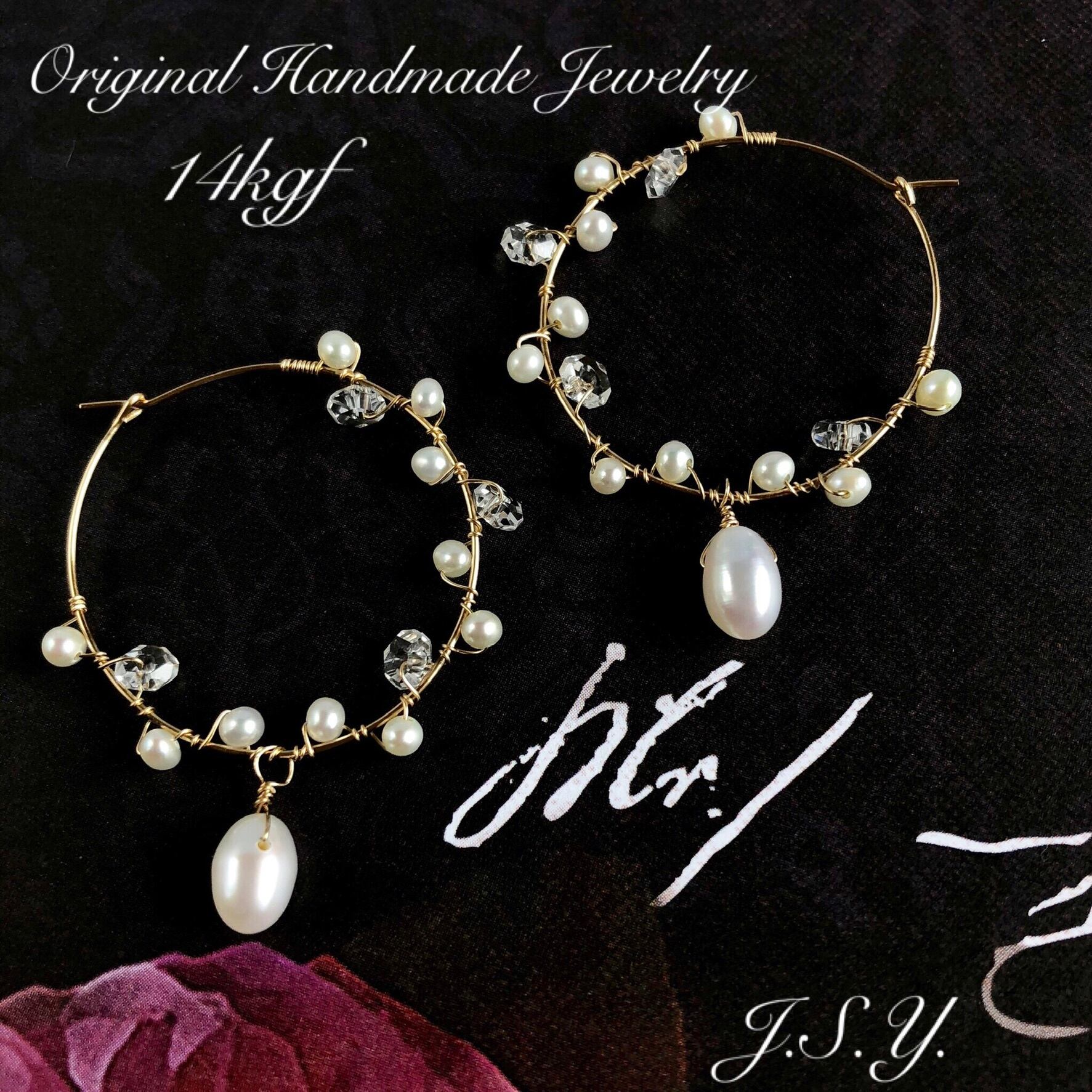 14kgf 素材のフープピアスに淡水パールとクリスタル(水晶)ををあしらって、エレガントなフープピアスにお仕立てしました。