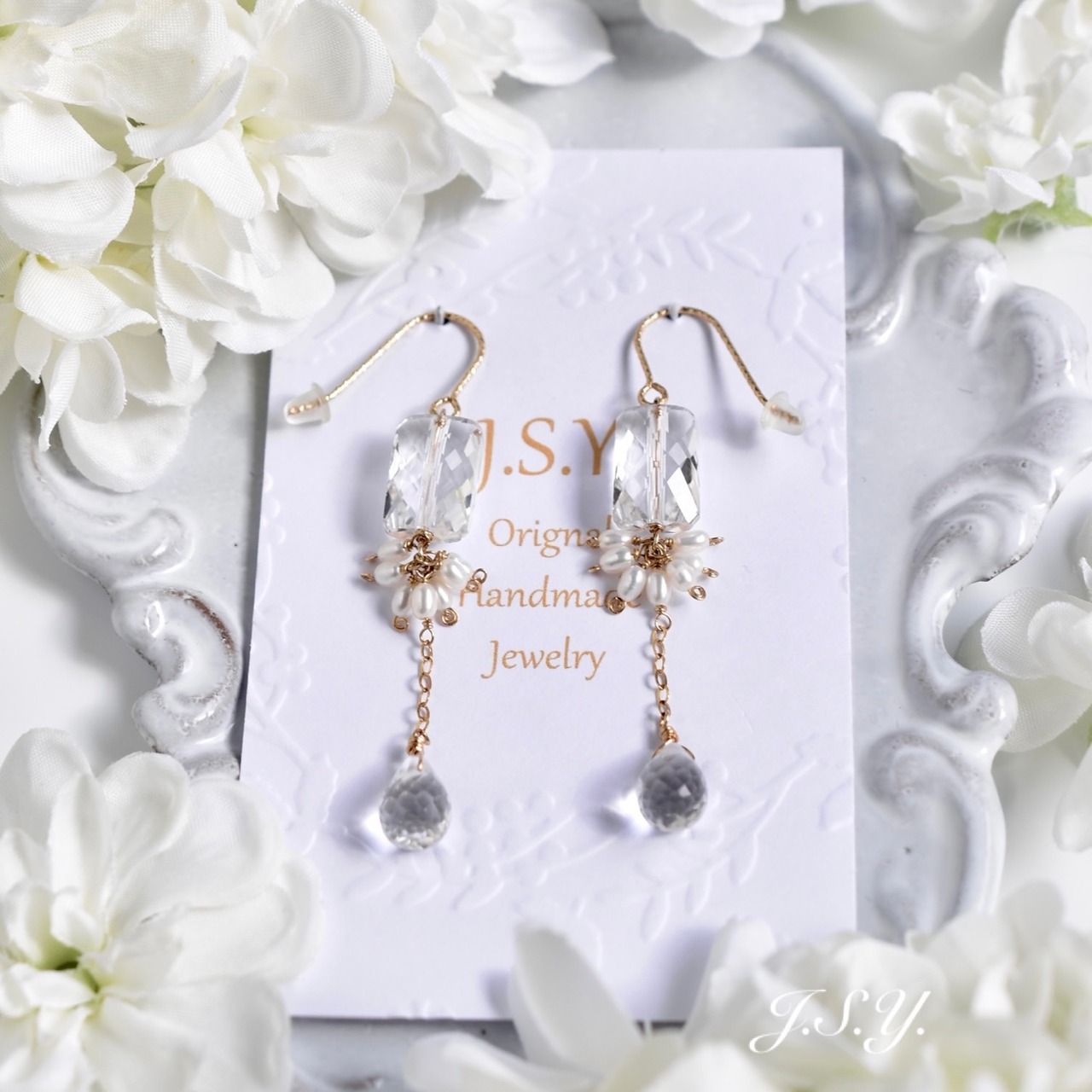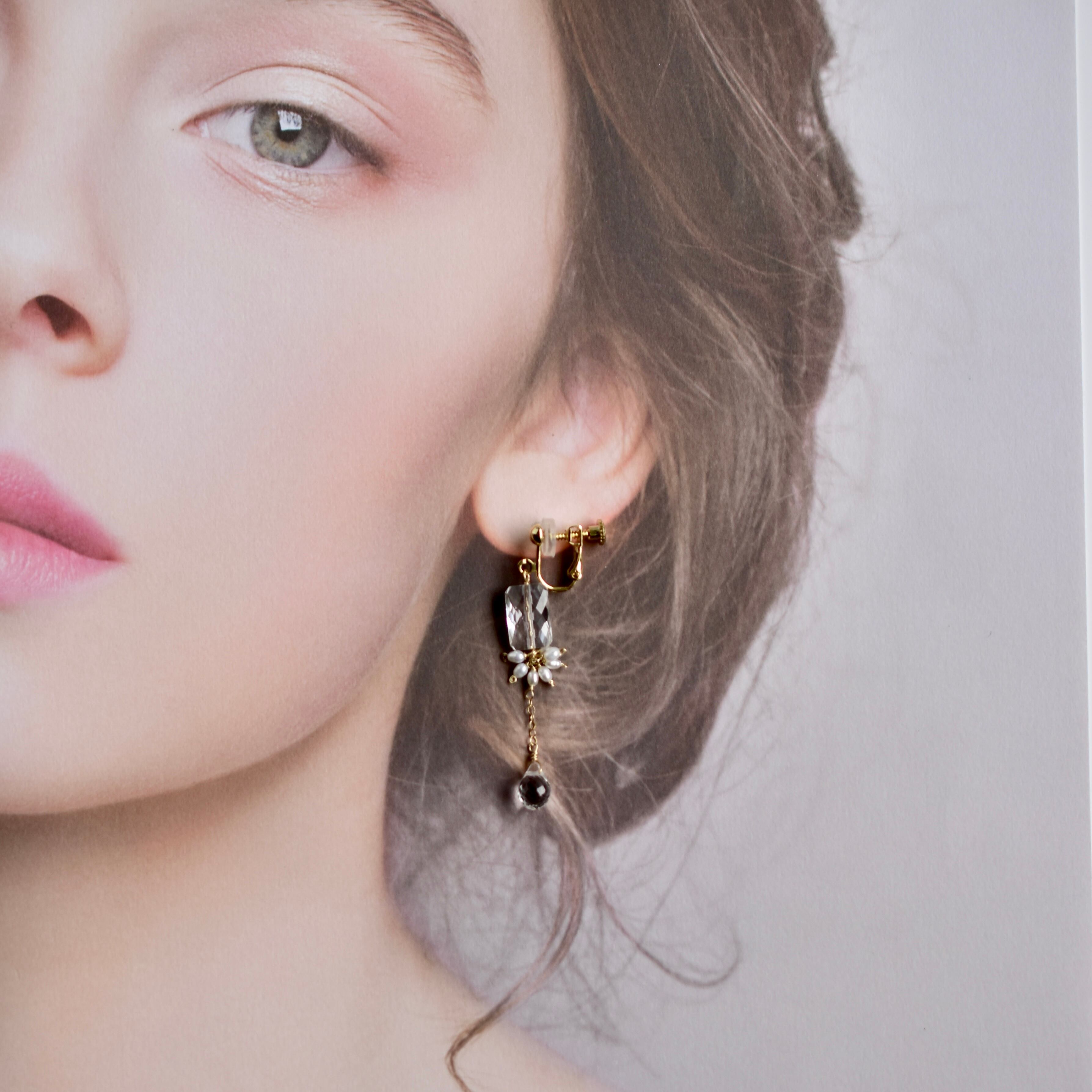 香水瓶みたいな形で、透明感、カットが美しい宝石質 クリスタル(水晶)とドロップカット のクリスタルをチェーンで繋げて、ライス型の淡水パールを添えて、エレガントなクリアピアス、イヤリングにお仕立てしました。
